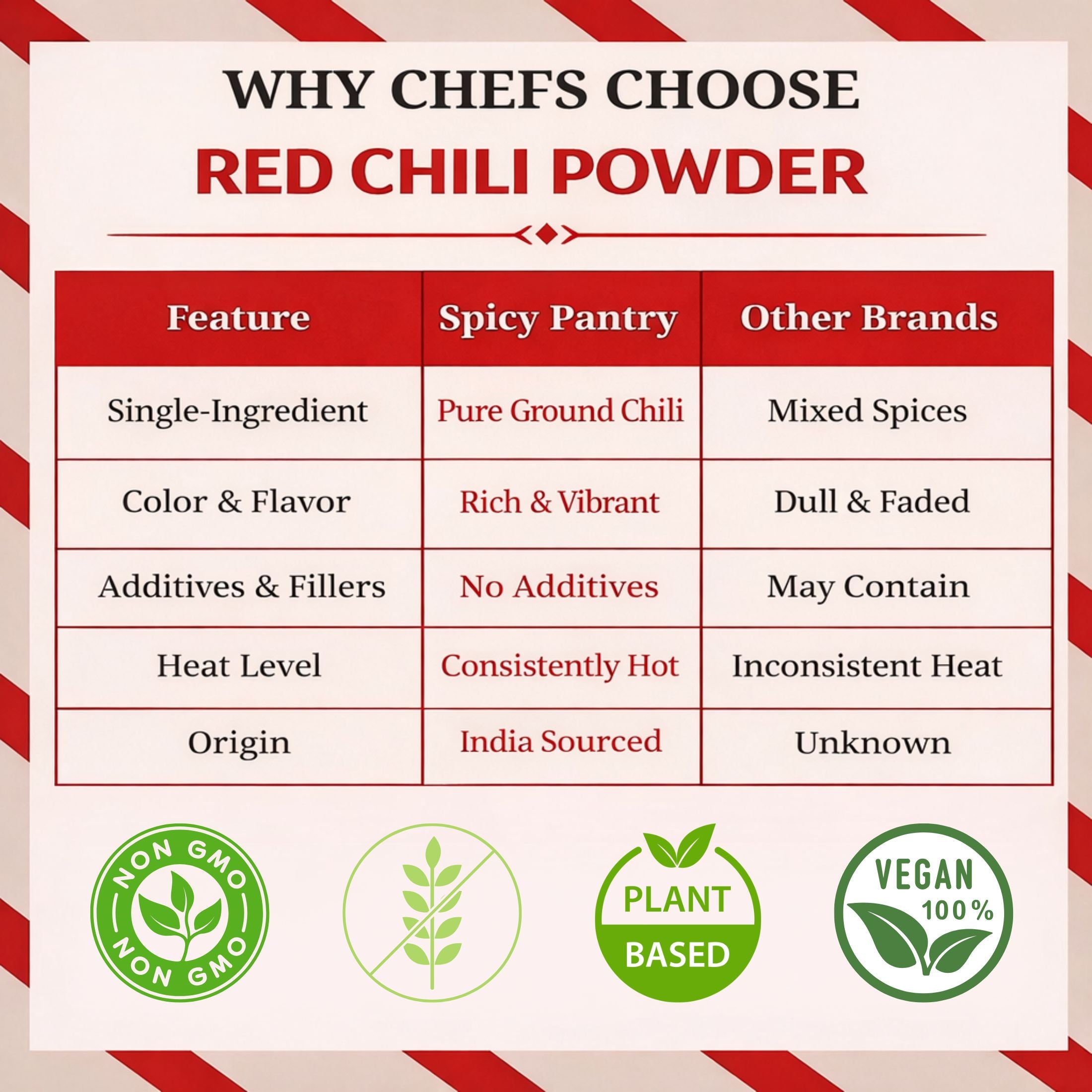 Spicy Pantry Red Chili Powder delivers consistent medium heat and vibrant color to curries, marinades, and rubs without the variability of whole chilies. This fine grind ensures even spice distribution for restaurant-quality results every time.